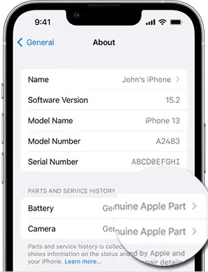 قبل iOS 15.2 ، كانت هذه الرسائل تنبه المستخدمين فقط إلى وجود أجزاء غير معروفة.\لن يظهر قسم سجل الأجزاء والخدمة إلا إذا تم استبدال شيء ما بداخل جهاز iPhone سواء البطارية أو الشاشة أوحتى الكاميرا الامامية و الخلفية ، وإلا فلن يكون مرئيًا.ستتضمن قطع غيار Apple الأصلية روابط إلى معلومات الخدمة المقابلة على الويب ، بما في ذلك التاريخ والوقت المحددين.